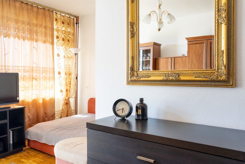 – salon z aneksem kuchennym i wyjściem na balkon,